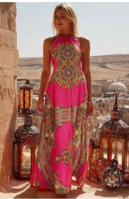Turn heads in this vibrant fuchsia maxi dress, designed with intricate medallion and mosaic-inspired prints that radiate elegance and bold femininity. The halter neckline flatters the shoulders while the flowing silhouette offers effortless movement, perfect for warm days, dreamy nights, and everything in between. Crafted for the woman who loves luxury with a touch of wanderlust, this dress blends exotic charm with timeless sophistication.